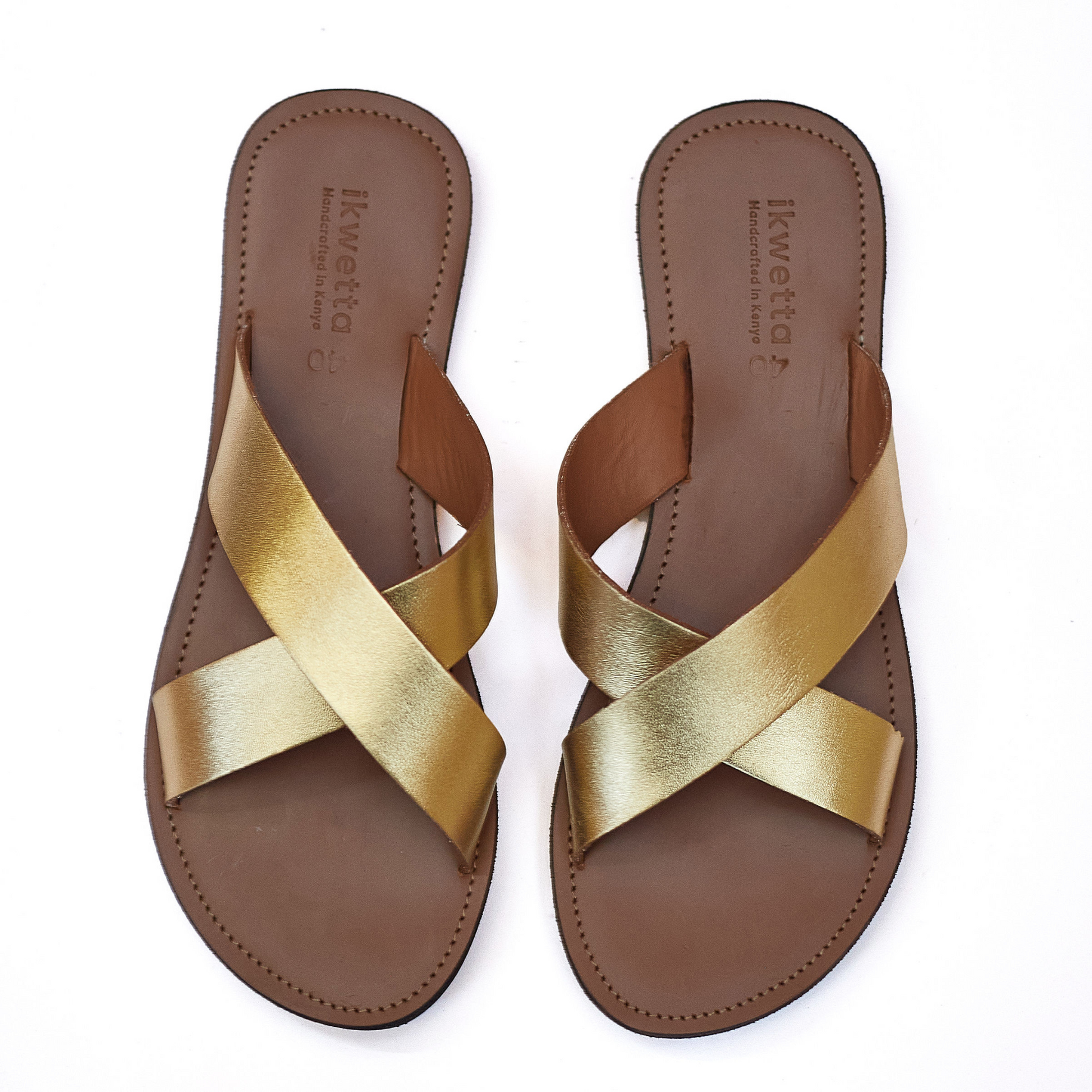 Slide into something classy with our leather sandals made with gold and silver foil straps.